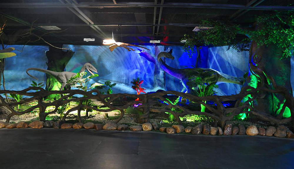 ③時光隧道造景與櫥窗真實化石標本和諧統一,真假難辨。