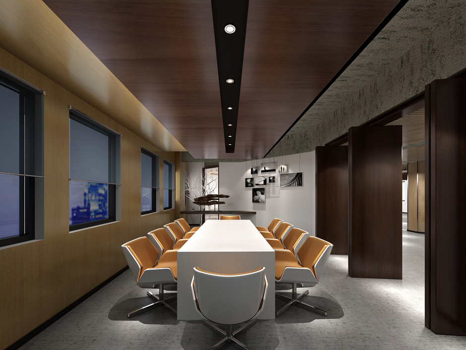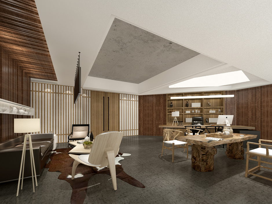 本案項目企業(yè)為生態(tài)板貿(mào)易公司,辦公空間帶一定的展示功能。項目地原為廠房,空間四平八穩(wěn),且層高偏底,柱網(wǎng)又集中在中部區(qū)。于帶有展示功能的辦公空間來說缺少必要的動線及展示性;于辦公空間又顯得呆板。根據(jù)空間需求,設(shè)計采用45度切隔方式將空間重新分隔。讓原有空間滿足功能需求之外又顯得生動。
