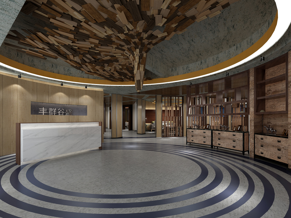 本案設(shè)計重在節(jié)約成本及材料運(yùn)用上,門廳處為本案設(shè)計重心,布局上采用圓弧形設(shè)計。結(jié)合45度切線設(shè)計形成撬動地球的形態(tài)。讓空間多一份動態(tài)又能讓視野開闊。天棚中心用廢棄的生態(tài)板下腳料組合成異形,平面看是一個展翅高飛的雄鷹,正面看則像一個鐘乳石。地面配以藍(lán)色環(huán)形。給人以水波的感覺。從而營造水滴石穿的效果。設(shè)計效果與企業(yè)宗旨不謀而合。